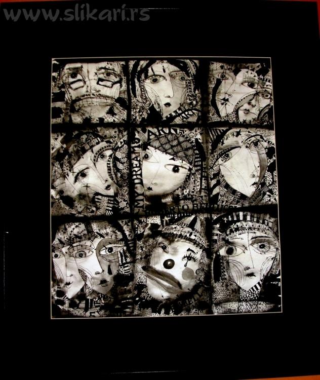 Tehnika: Lavirani tus u boji, akrilik, kolaz